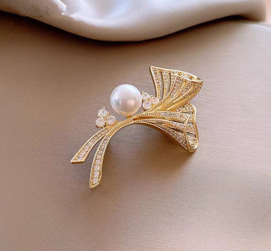 Ginkgo Perlenbrosche Zirkonia Vergoldet